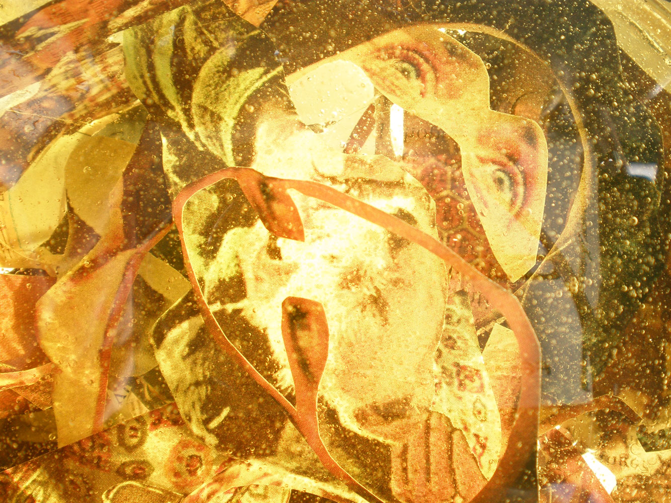 The idea for this piece stemmed from the constant desire to collect and repurpose denaturalized remnants.Water and oil will always separate because of their properties.Despite this they find a way of combining to express something new. With magazine clippings by choosing what to keep, we are also actively making a decision on what not to keep. It’s a metaphor for how we approach our interactions with others. The amber color of this work conjured equal feelings of hope and despair, but also memories.In doing so, it blurs the line between reality and fiction.