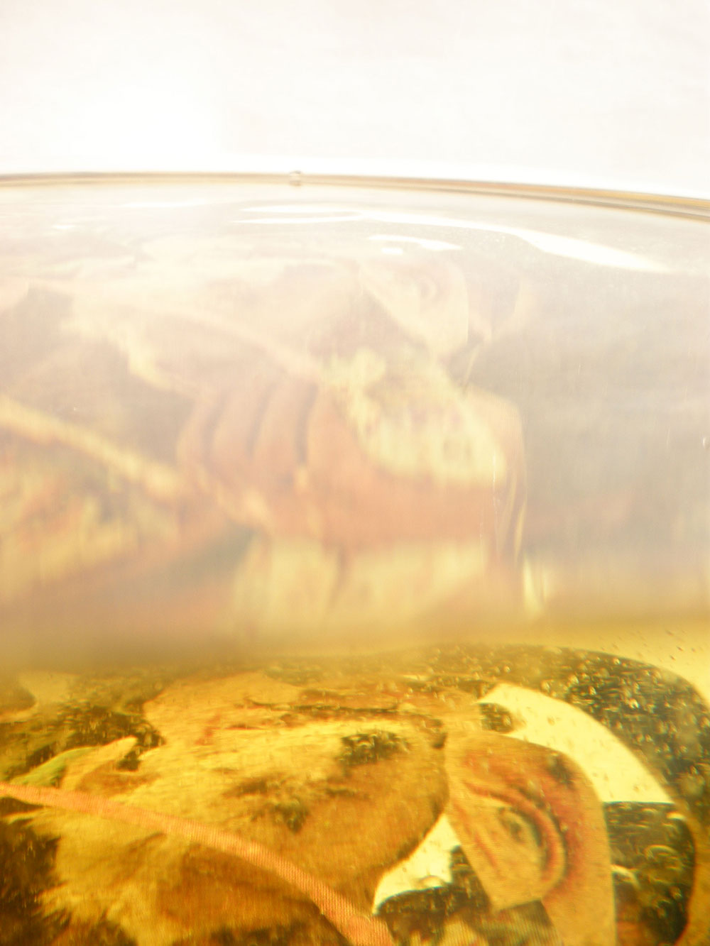 Various magazine clippings of people and animals were put in a vase then filled with water and oil and gently stirred and observed. Bubbles formed as the water and oil began to separate. At the same time, The clippings swirled unpredictably.